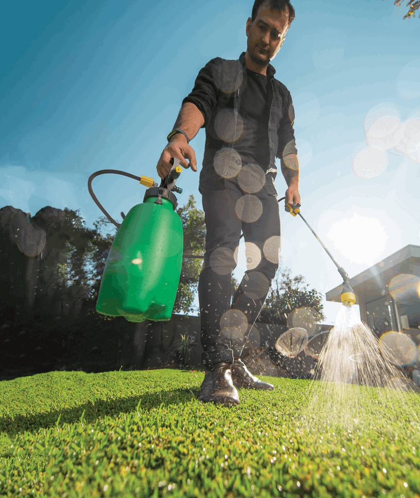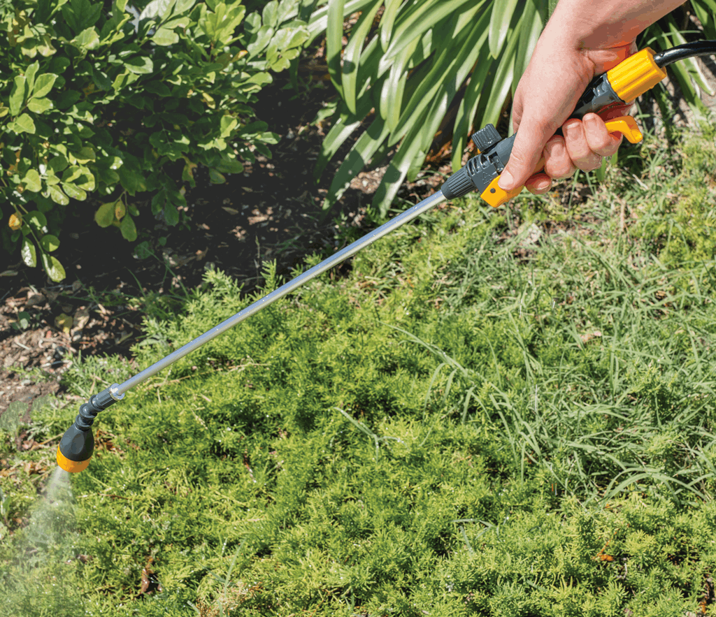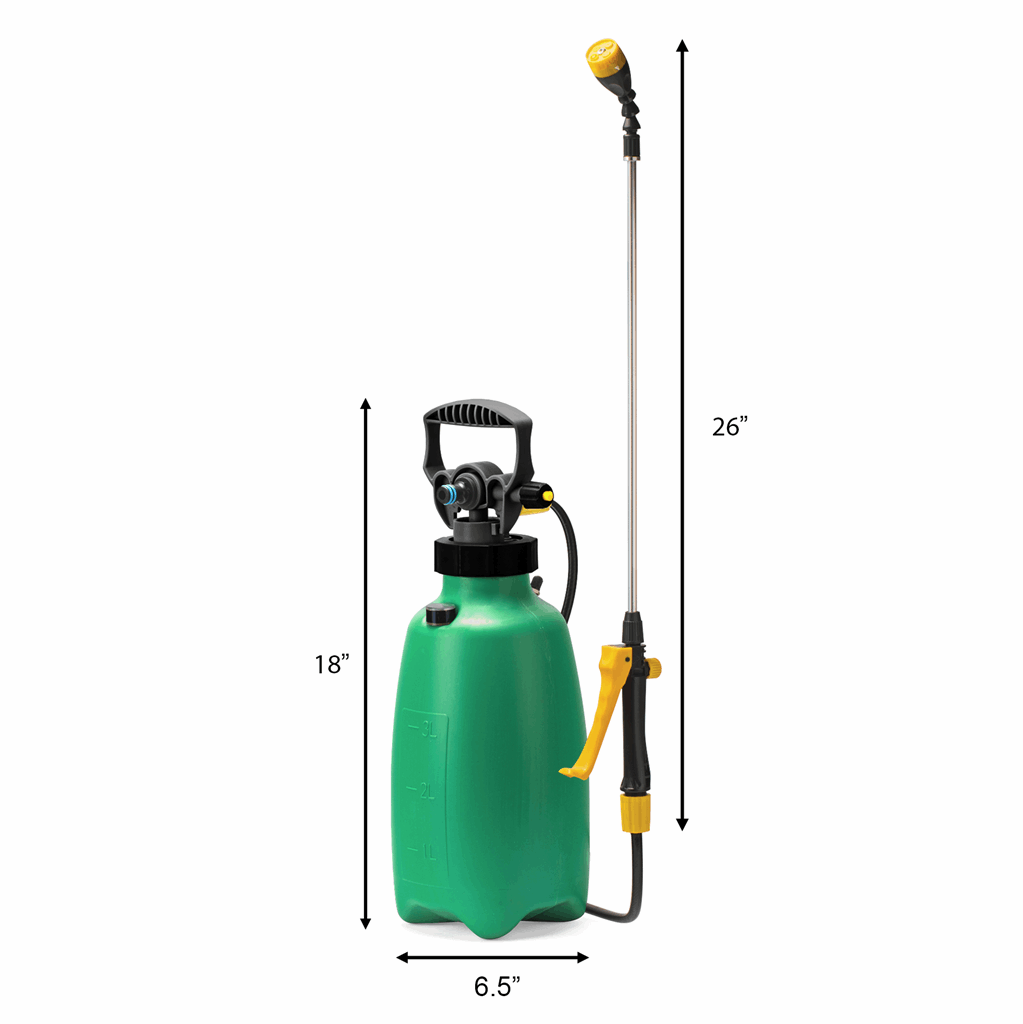 NO pump NO gas NO charge NO battery. .8 gallon sprayer. Just fill & spray. Full pressure from full to empty with the Power Pouch Self-Pressurized System.4 Pattern spray wand reaching as high at 16′. It comes with quick connector hose fittings. Intended use is for application of pesticides fertilizers herbicides and light watering. Handheld with comfort grip.