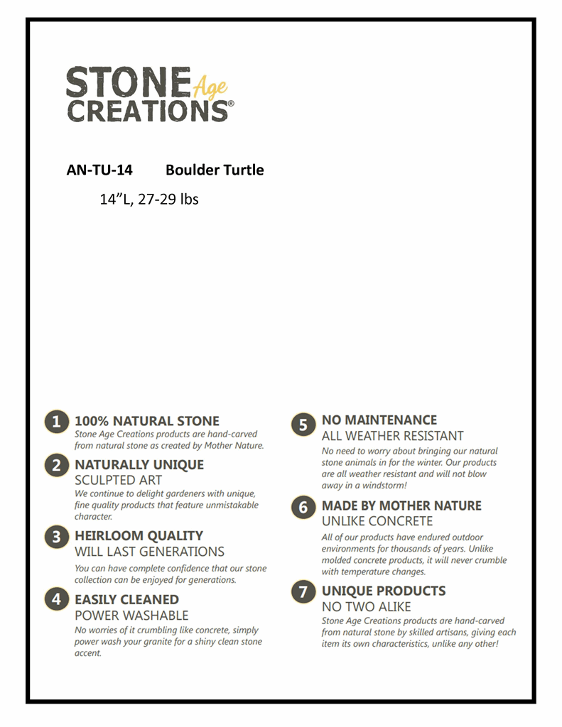 These turtles begin as a granite boulder that is selected because it has the proper size and characteristics needed to be transformed into a turtle. Each boulder is then carved and sculpted by skilled craftsmen to become unique works of art. Every piece will have its own character and variations in size and shape are to be expected. Since each item is unique size and weight are approximate. 14″L 27-29 lb