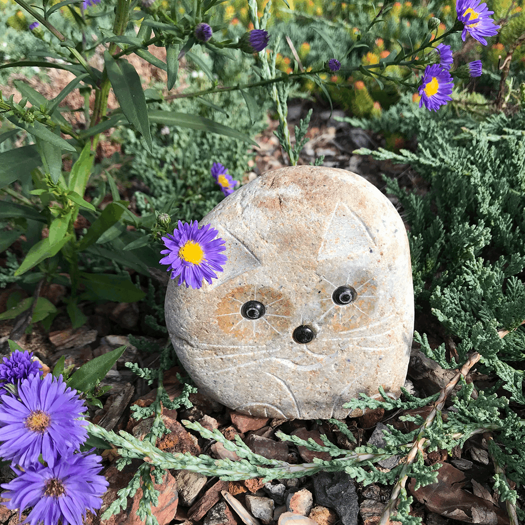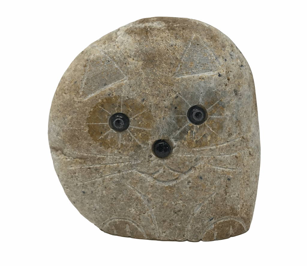 Granite boulder. Natural boulder body with hand-carved accents. Each cat has its own unique characteristics. Since each boulder pet is unique height and weight are approximate. 4″ H 1-2 lbs