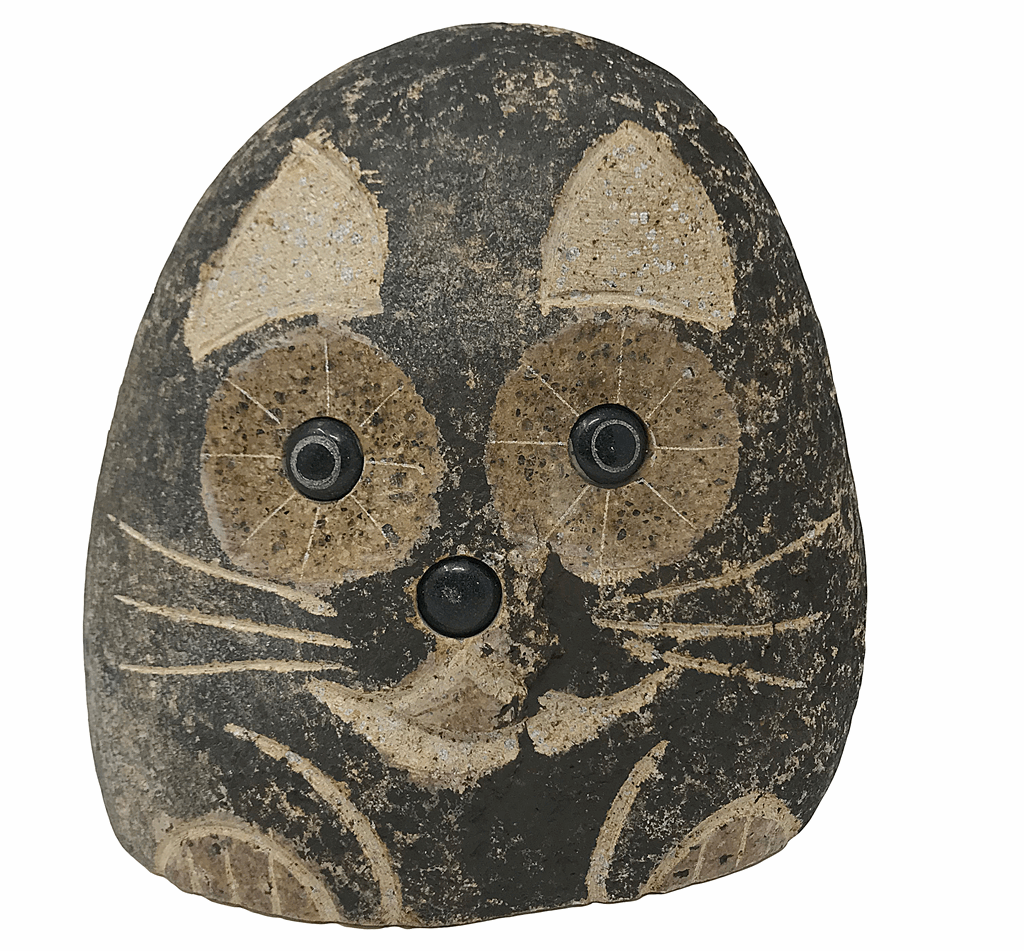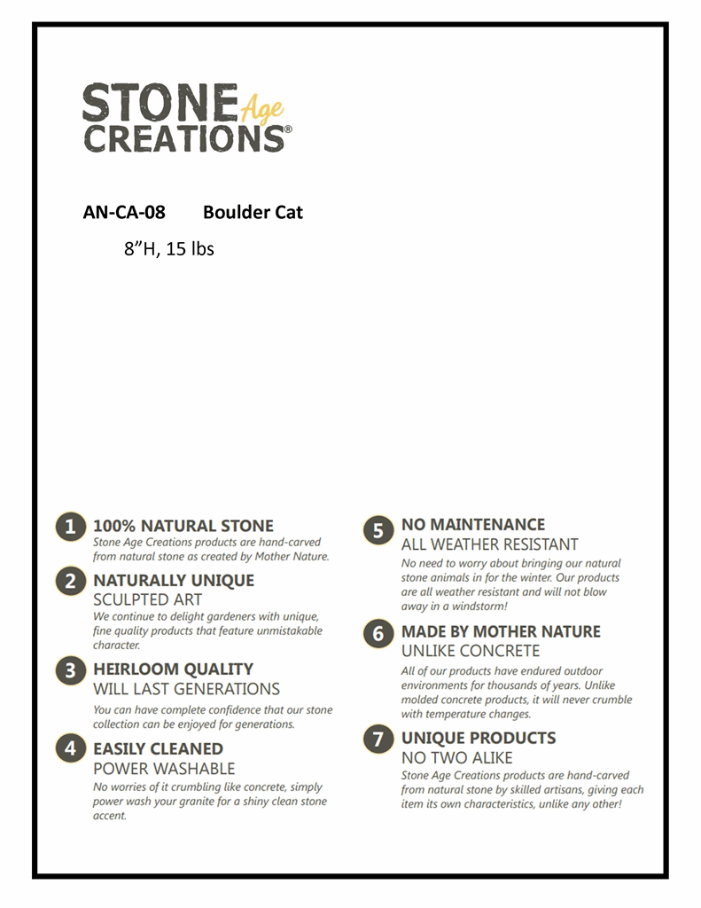 Granite boulder. Natural boulder body with hand-carved accents. Each cat has its own unique characteristics. Since each boulder pet is unique height and weight are approximate. 8″ H 12-14 lbs