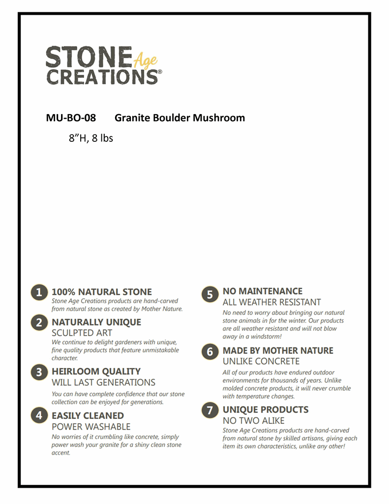 Our whimsical stone mushrooms can be found peeking out of gardens across the country!Natural Granite Boulder. 8″H approx 8 lbs