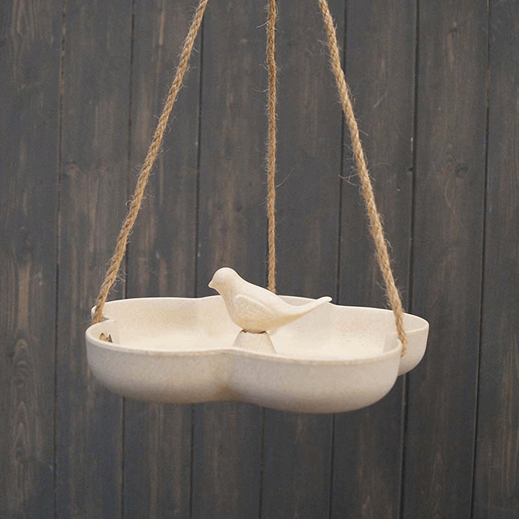 The Bamboo Hanging Bird Bath/Feeder beautifully crafted from Bamboo is natural in color and a product of the Earthy Sustainable line. This line repurposes agricultural waste by blending it with resin diverting it from being burned and releasing CO2. Instead of growing new materials Earthy Sustainable utilizes the discarded parts of commercial crops to create their products which are durable against frost and suitable for both outdoor and indoor settings. These baths or feeders have a lifespan of 2-3 years and measure 9″ wide 9″ deep and 1.5″ high.