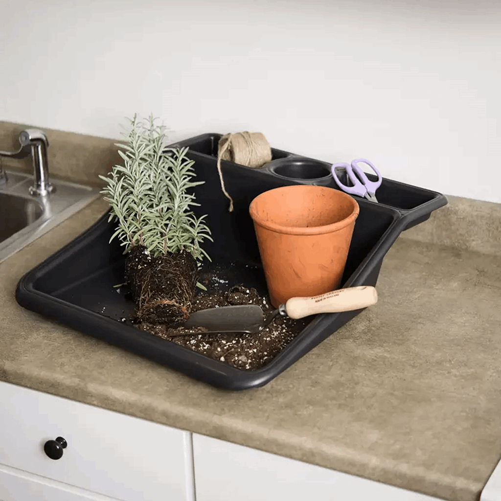 This Compact Tidy Tray is a tough compact one-piece tray! With its integral shelf it is an essential garden accessory. Ideal for potting mixing and growing. Lightweight easy to use indoors or out! 19″L x 19.5″W x 6″H 2lbs. The black tray is made of 100% recycled plastic. Choose from Black or Green.