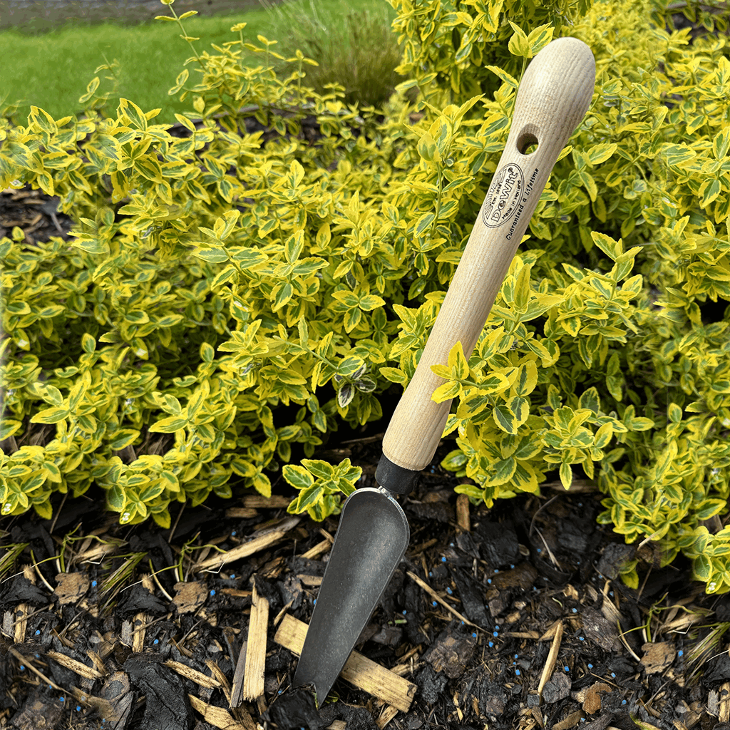 Works like a transplant trowel and a weedpopper all in one. The flat arm design makes this trowel virtually impossible to bend. It’s designed for a two-handed grip and the extended handle is ideal for seniors or for use in raised beds. The head measures 5 inches in length and 3.25 inches in width with a total length of 16.5 inches and a weight of 0.6 pounds.