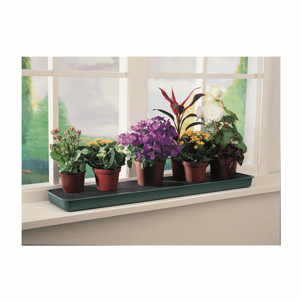 Windowsills can offer ideal light conditions for house plants. This windowsill sized self watering tray works great as a holiday watering system. Once filled with water it will keep potted plants watered for up to 14 days.The unit features a base reservoir tray which contains a ‘stilted’ inner support platform which is covered in capillary matting. The base tray provides a reservoir of 1 gallon of water. By ensuring the exposed compost at the bottom comes in contact with the capillary matting the plants will water themselves! 30″L x 7″W x 1.5″H 2.7lbs 1 gallon reservoir