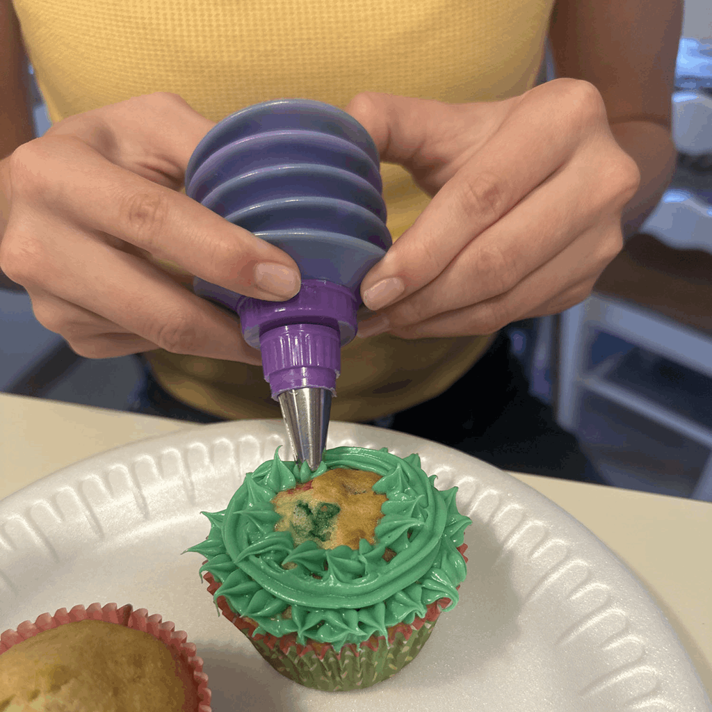 Begin your baking journey! Each set comes with a mixing bowl a plastic spoon a plastic spatula a cookie cutter an icing squirter with a stainless-steel nozzle a wooden rolling pin four silicone cupcake cases a cotton apron a chef’s hat and recipe cards for cakes and cookies all neatly packed in a large transparent plastic bag. Choose from Pink or Blue every piece is designed to fit inside the transparent plastic bag. The bowl measures 7.5 inches in diameter. It is not recommended for children under three years old.