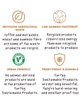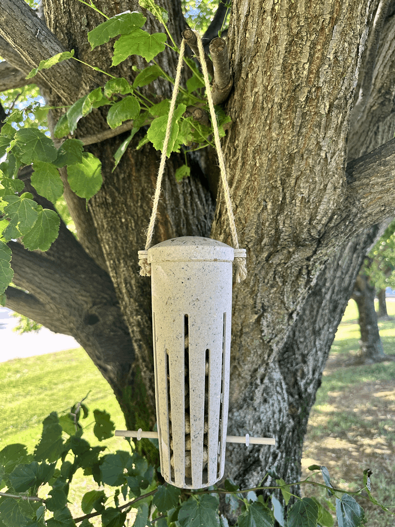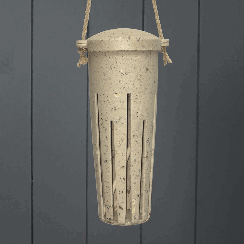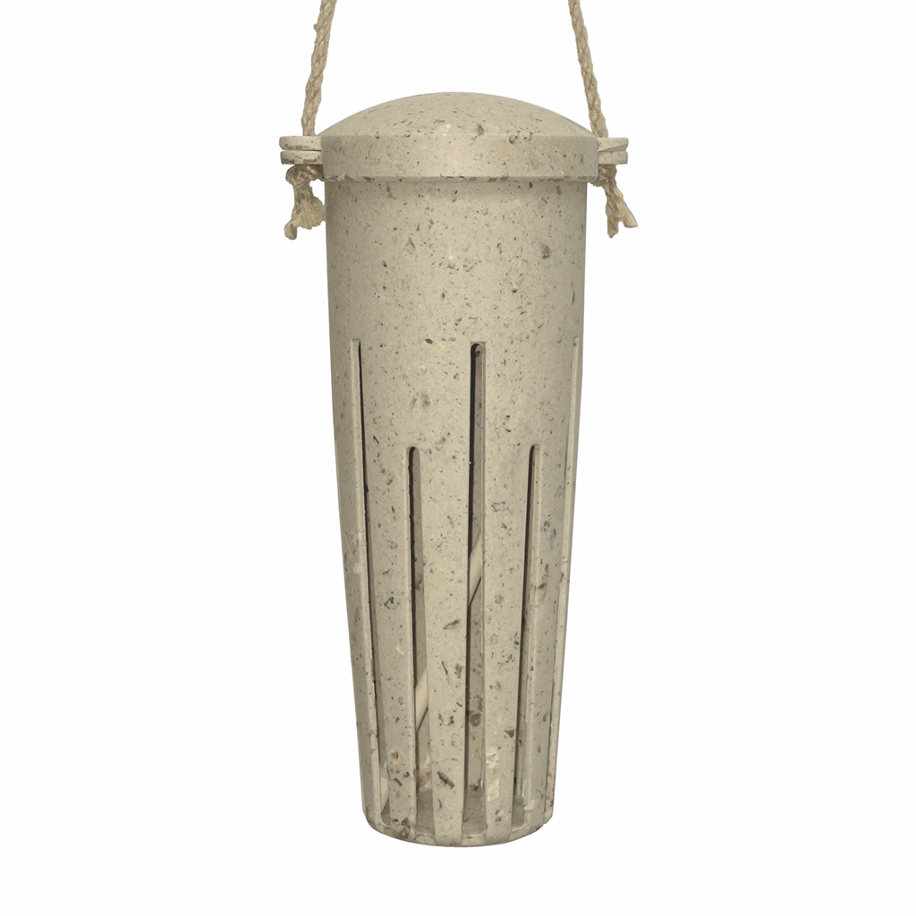This unique Peanut Bird Feeder is made with Coffe Husks. The Earthy Sustainable line processes agricultural waste blending it with resin. A lot of time energy and water goes into growing crops yet most of the plant goes unwanted and would normally be burnt releasing harmful CO2 into the environment. Instead the waste material is processed to create Earthy sustainable products. None of the ingredients are grown specifically for Earthy. The unwanted parts of commercially-farmed crops are used to make our feeders. These products are frost proof and suitable for outdoor and indoor use. Lifespan 2-3 years. Dimensions are 9.25″ x 3.25″Dia.