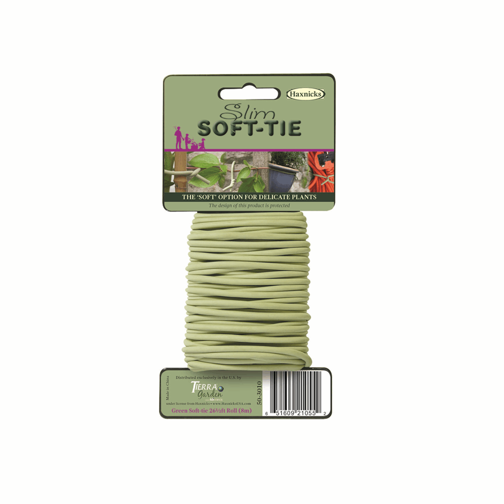 Protect the stems of your plants from bruising and breakage with the Slim Soft-Tie an innovative multi-purpose plant and garden tie. The tie has an inner core of galvanized steel wire making it incredibly strong. For nearly 20 years the Haxnicks company has been designing and manufacturing innnovative garden care and plant protection products for their customers in England. Tierra Garden is proud to offer this distinctive line in the United States! 8m Roll chunky 3.5mm 0.14″ diameter. Product: 315″L x 0.14″W 0.5lbs. Pack: 3.9″W x 7.9″H. Pack Size: 1