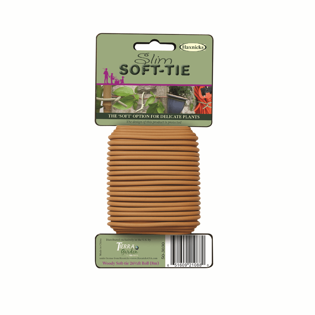 Protect the stems of your plants from bruising and breakage with the Slim Soft-Tie and innovative multi-purpose plant and garden tie. These ties have an iner core of galvanized steel wire making it incredibly strong. For nearly 20 years the Haxnicks company has been designing and manufacturing innnovative garden care and plant protection products for their customers in England. Tierra Garden is proud to offer this distinctive line in the United States! 8m Roll chunky 3.5mm 0.14″ diameter. Product: 315″ x 0.14″W 0.5lbs. Pack: 3.9″W x 7.9″H. Pack Size: 1