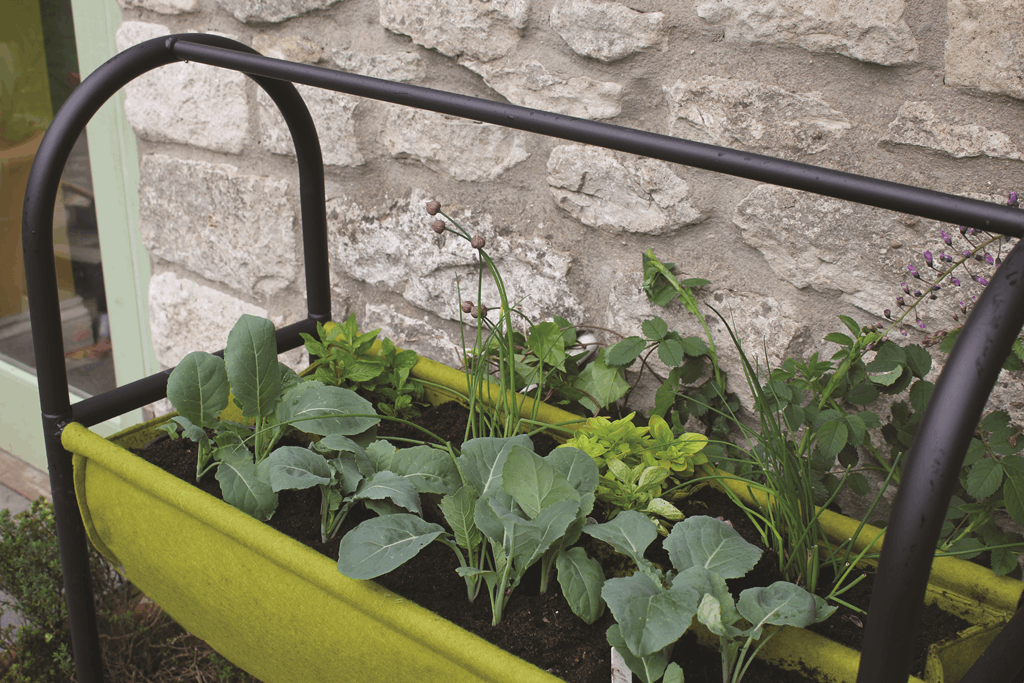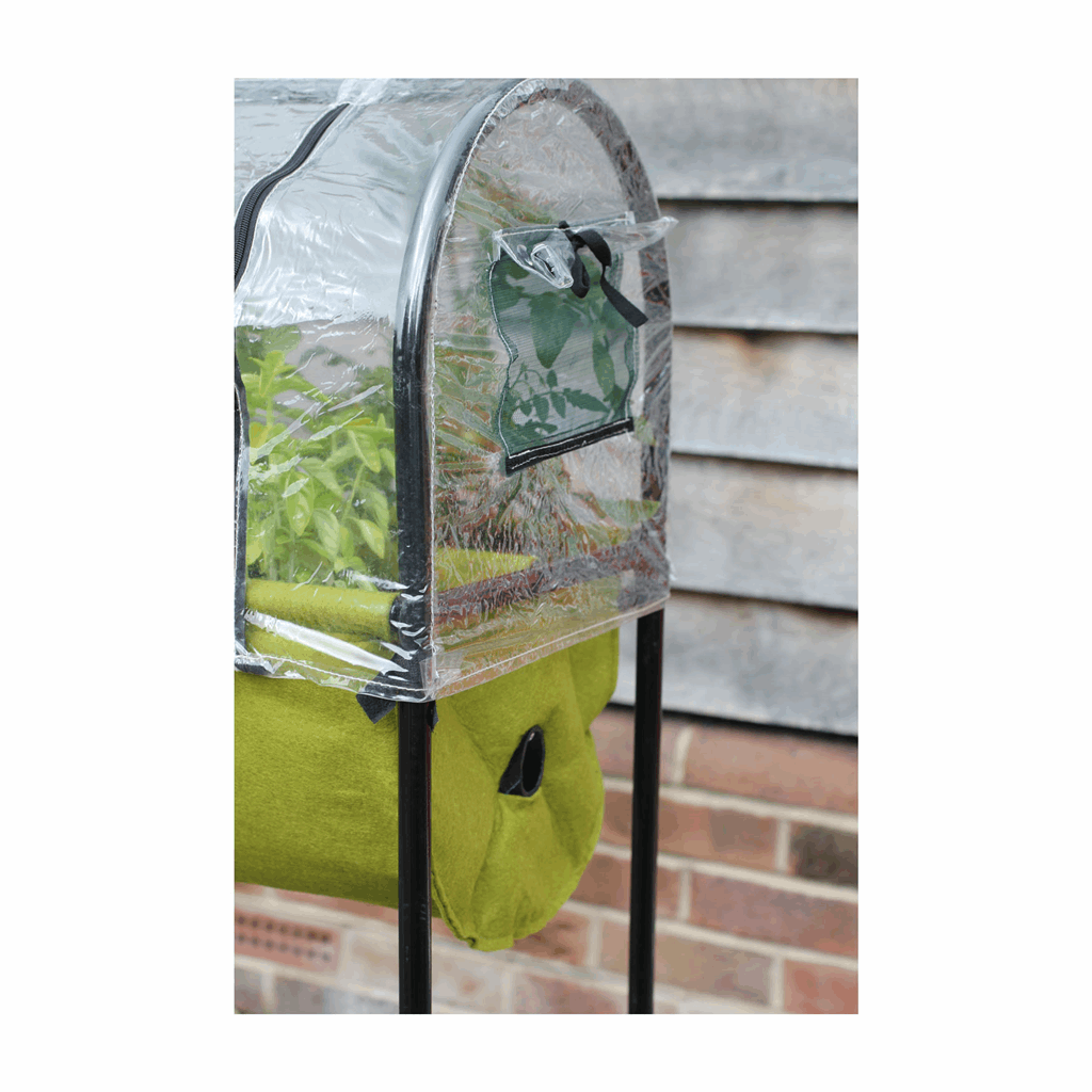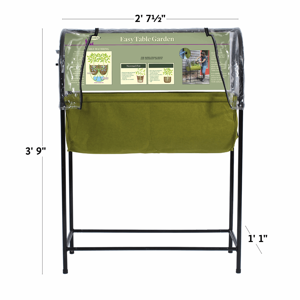 Easy Table Garden. Vigoroot fabric table planter with integral self-watering system and poly protection cover. Hidden reservoir waters plants via capillary action. Air pruning fabric for healthy roots and excellent drainage. Removable poly protection cover. No pipes tubes or electrics required. An easily accessible growing system for small gardens roof terraces patios and balconies. Product: 31.5″W x 45.3″H x 13″D 9lbs. Pack: 13.7″W x 33.5″H x 3.5″D. Pack Size: 1. Troughs Size: 31.5″W x 9.5″D
